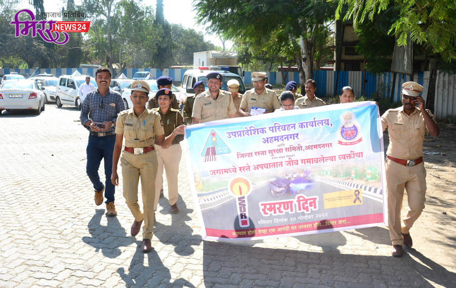 अहमदनगर (प्रतिनिधी)- उपप्रादेशिक परिवहन कार्यालय आणि जिल्हा रस्ता सुरक्षा समिती अहमदनगर यांच्या वतीने रस्ते अपघातात जीव गमावलेल्या व्यक्तींना श्रद्धांजली वाहून अपघात टाळण्यासाठी वाहतुकीच्या नियमांचे पालन करण्याबाबत शहरातून जनजागृती रॅली काढण्यात आली. तर अपघातग्रस्तांचे जीवनदूत म्हणून कर्तव्य बजावण्याचे नागरिकांना माहिती पत्रकांचे वाटप करण्यात आले.