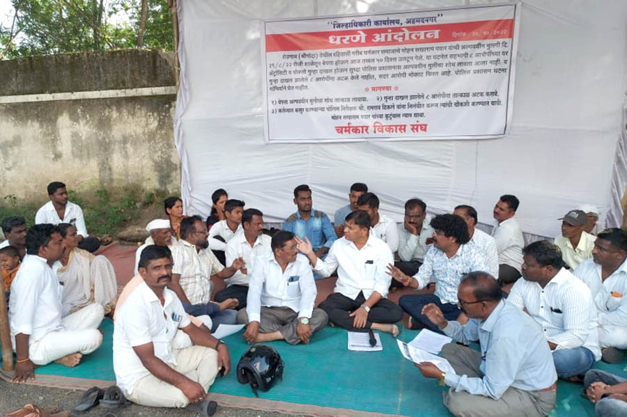 अहमदनगर (प्रतिनिधी)- अल्पवयीन मुलगी बेपत्ता झाल्याचा श्रीगोंदा पोलीस स्टेशनला गुन्हा दाखल होऊन, दीड महिने उलटूनही तपास लागत नसल्याने चर्मकार विकास संघाच्या वतीने पिडीत कुटुंबीयांसह गुरुवारी (दि.27 ऑक्टोबर) जिल्हाधिकारी कार्यालया समोर धरणे आंदोलन करण्यात आले. याप्रकरणी आंदोलकांनी निवासी उपजिल्हाधिकारी राजेंद्रकुमार पाटील व पोलीस अधीक्षक राजेश ओला यांच्याशी सकारात्मक चर्चा करुन आंदोलन तात्पुरत्या स्वरुपात स्थगित करण्यात आले.
