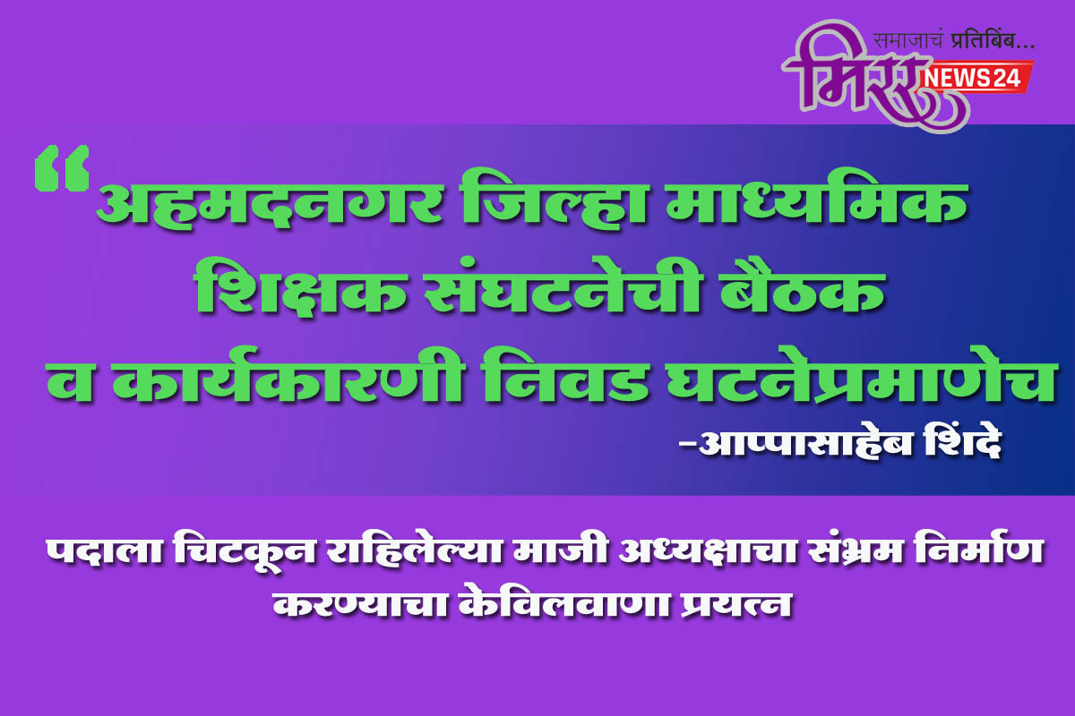 अहमदनगर (प्रतिनिधी)- अहमदनगर जिल्हा माध्यमिक शिक्षक संघटनेची बैठक घटनेप्रमाणे होवून कार्यकारणी निवड करण्यात आली आहे. साडे पाच वर्षे पदाला चिटकून राहिलेल्यांनी पदवीधर मतदारसंघाची निवडणुक डोळ्यासमोर ठेवून पद न सोडण्याचा व संभ्रम निर्माण करण्याचा केविलवाणा प्रयत्न सुरु असल्याचा टोला नवनिर्वाचित माध्यमिक शिक्षक संघटनेचे अध्यक्ष आप्पासाहेब शिंदे यांनी माजी अध्यक्ष राजेंद्र लांडे यांना लगावला आहे.