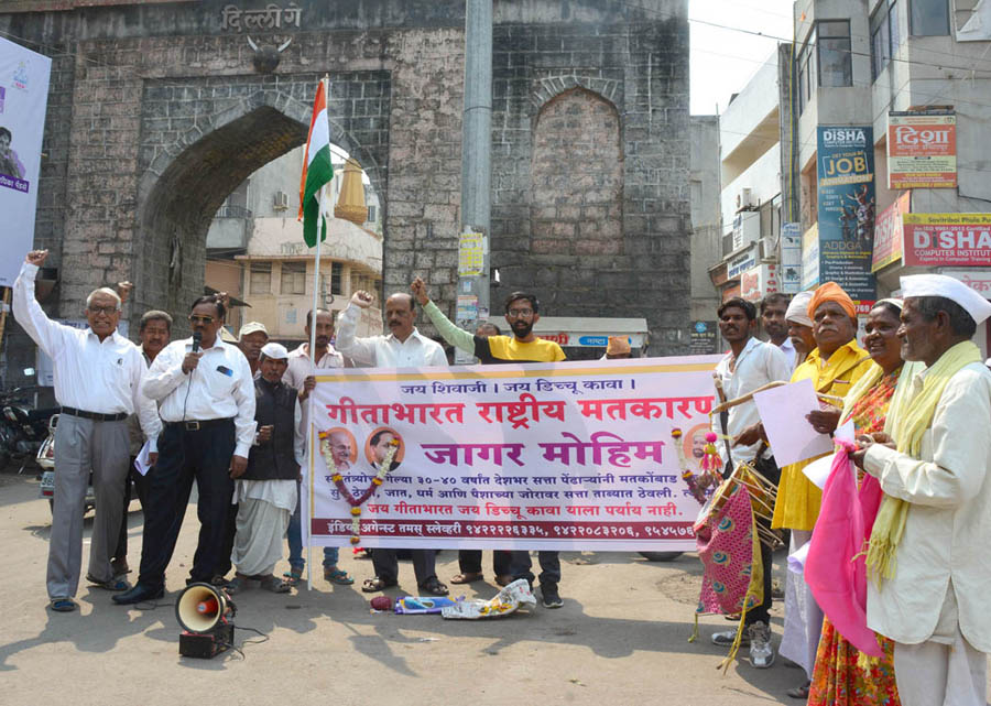 अहमदनगर (प्रतिनिधी)- आमीष दाखवून व जातीच्या नावाने मतं घेऊन निवडून आलेल्या सत्तापेंढारींना सत्तेतून कायमचे पायउतार करण्यासाठी इंडिया अगेन्स्ट तमस स्लेव्हरी संघटनेच्या वतीने शहरातील दिल्लीगेट वेस येथून गीताभारत राष्ट्रीय मतकारण महाजागर सुरू करण्यात आले. संबळाच्या निनादात कार्यकर्त्यांनी यावेळी जय शिवाजी… जय डिच्चू कावा! आणि जय गीताभारत… अशा घोषणा दिल्या.
