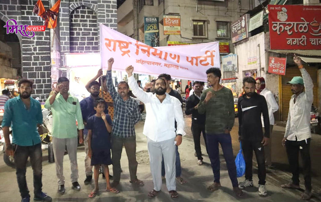 अहमदनगर (प्रतिनिधी)- देशात हिंदू जनसमुदायावर होत असलेल्या हल्ल्याचा व नुकतेच उत्तर प्रदेश मधील बरेली मध्ये कावड मिरवणुक व मेवात येथे भगवा यात्रेत जिहादी प्रवृत्तींकडून झालेल्या हल्ल्याचा राष्ट्र निर्माण पार्टीच्या वतीने शहरातील दिल्लीगेट वेस समोर निषेध नोंदविण्यात आला. यावेळी जिल्हाध्यक्ष उत्कर्ष गीते, नील गांधी, वैभव रासने, अमोल भंडारे, योगेश राऊत, मुनोत आदी उपस्थित होते.