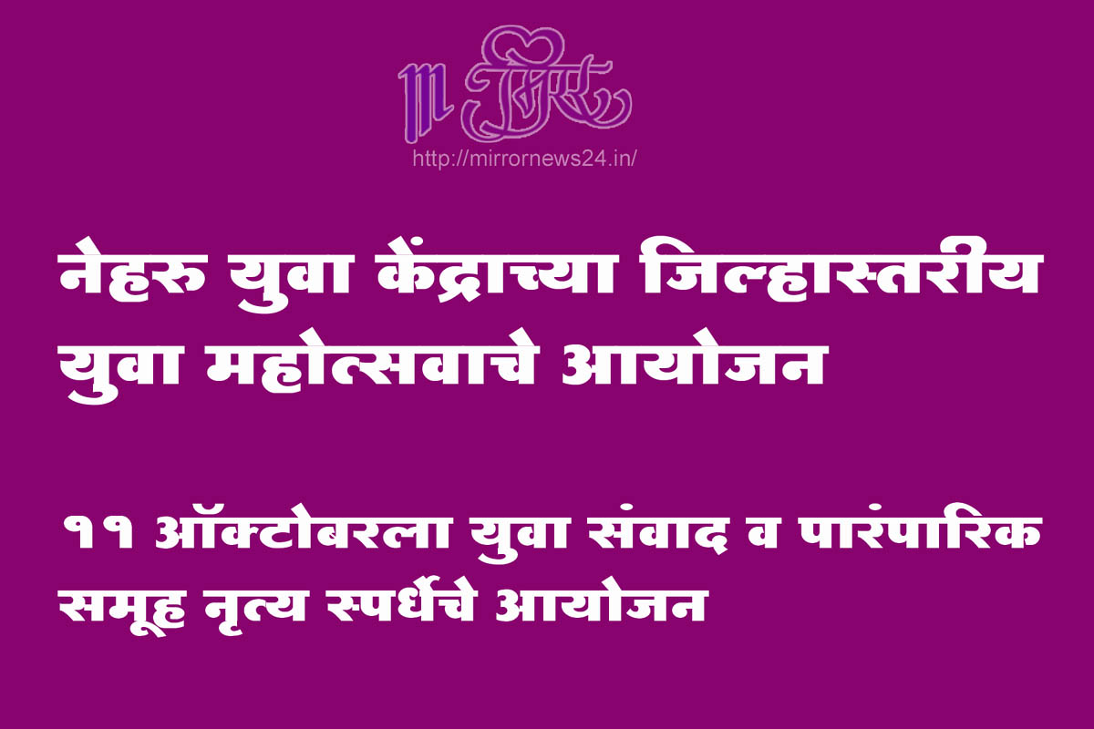 अहमदनगर (प्रतिनिधी)- युवा कार्यक्रम व क्रीडा मंत्रालयातंर्गत संचलित नेहरू युवा केंद्राच्या वतीने जिल्हास्तरीय युवा महोत्सव युवा महोत्सवाचे आयोजन करण्यात आले आहे. या युवा महोत्सवात 11 ऑक्टोबर रोजी युवा संवाद व पारंपारिक समूह नृत्य स्पर्धा रंगणार असल्याची माहिती नेहरु युवा केंद्राचे राज्य उपनिदेशक शिवाजी खरात यांनी दिली.