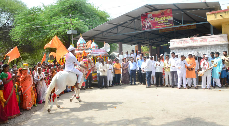 पारंपारिक वाद्यांच्या गजरात गावात दिंडीची प्रदक्षिणा मारण्यात आली. दिंडीच्या स्वागतासाठी महिलांनी घरासमोर सडा-रांगोळी टाकली होती. दिंडीच्या अग्रभागी शालेय विद्यार्थी भगवे ध्वज व लेझिम घेऊन सहभागी झाले होते. वारकरी संप्रदायाची पताका खांद्यावर घेऊन ज्ञानोबा माऊली तुकारामचा जयघोष करणारे झेंडेकरी, टाळकरी, भजनी मंडळी, फुलांनी सजवलेले रथ व डोक्यावर तुळशी, कळस घेतलेल्या महिला दिंडीत सहभागी झाल्या आहेत. दिंडीतील रथाचे दर्शन घेण्यासाठी भाविकांनी गर्दी केली होती.