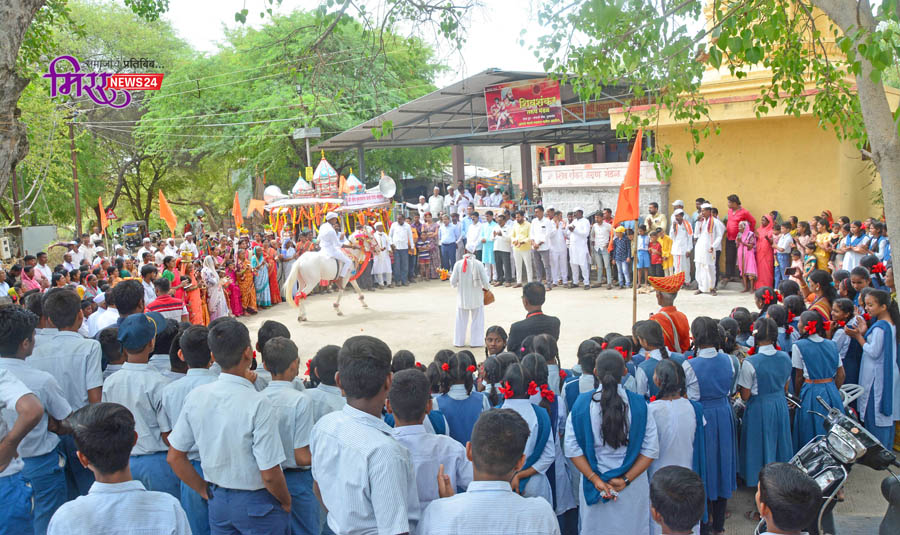 पारंपारिक वाद्यांच्या गजरात गावात दिंडीची प्रदक्षिणा मारण्यात आली. दिंडीच्या स्वागतासाठी महिलांनी घरासमोर सडा-रांगोळी टाकली होती. दिंडीच्या अग्रभागी शालेय विद्यार्थी भगवे ध्वज व लेझिम घेऊन सहभागी झाले होते. वारकरी संप्रदायाची पताका खांद्यावर घेऊन ज्ञानोबा माऊली तुकारामचा जयघोष करणारे झेंडेकरी, टाळकरी, भजनी मंडळी, फुलांनी सजवलेले रथ व डोक्यावर तुळशी, कळस घेतलेल्या महिला दिंडीत सहभागी झाल्या आहेत. दिंडीतील रथाचे दर्शन घेण्यासाठी भाविकांनी गर्दी केली होती.