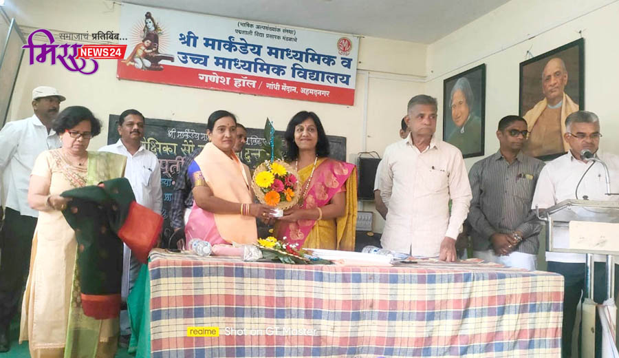 गांधी मैदान येथील श्री मार्कंडेय माध्यमिक व उच्च माध्यमिक विद्यालयाच्या पर्यवेक्षिका सरोजिनी रच्चा यांचा सेवापूर्ती निमित्त पद्मशाली विद्या प्रसारक मंडळ व विद्यालयाच्या वतीने सन्मान करण्यात आला. यावेळी प्रा.डॉ. देशमुख बोलत होत्या. संस्थेचे अध्यक्ष बाळकृष्ण सिद्दम यांच्या अध्यक्षतेखाली झालेल्या सेवापुर्तीच्या कार्यक्रमाप्रसंगी संस्थेच्या सचिव डॉ. रत्नाताई बल्लाळ, विश्वस्त राजेंद्र म्याना, माजी मुख्याध्यापक दिपक रामदिन, प्राथमिक विद्यालयाचे मुख्याध्यापक श्रीनिवास मुत्याल, शिक्षक प्रतिनिधी प्रा. भानुदास बेरड, उच्च माध्यमिकचे समन्वयक प्रा. उत्तम लांडगे, श्रमिक नगरच्या मुख्याध्यापिका विद्याताई दगडे आदींसह शालेय आजी-माजी शिक्षक व शिक्षकेतर कर्मचारी उपस्थित होते.