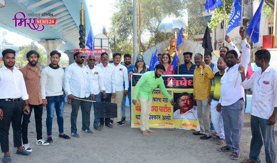 अहमदनगर (प्रतिनिधी)- भाजपचे नेते आणि उच्च व तंत्र शिक्षण मंत्री चंद्रकांत पाटील यांनी भारतरत्न डॉ. बाबासाहेब आंबेडकर, क्रांतीसुर्य महात्मा फुले व कर्मवीर भाऊराव पाटील यांच्याबद्दल केलेल्या वादग्रस्त वक्तव्याचा रिपब्लिकन पार्टी ऑफ इंडियाच्या (आठवले) वतीने निषेध नोंदविण्यात आला. मार्केटयार्ड येथील डॉ. बाबासाहेब आंबेडकर यांच्या पुतळ्यासमोर चंद्रकांत पाटील यांच्या प्रतिमेस जोडे मारुन जोरदार निदर्शने करण्यात आली.