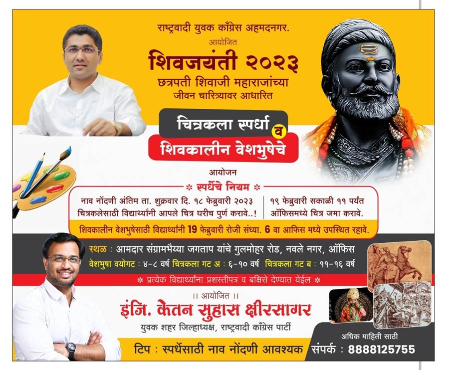 अहमदनगर (प्रतिनिधी)- छत्रपती शिवाजी महाराज यांच्या जयंतीनिमित्त राष्ट्रवादी युवक काँग्रेसच्या वतीने चित्रकला व शिवकालीन वेशभूषा स्पर्धेचे आयोजन केले आहे. आमदार संग्राम जगताप यांच्या मार्गदर्शनाखाली होत असलेल्या या स्पर्धेत शहरातील सर्व शालेय विद्यार्थ्यांना सहभागी होण्याचे आवाहन राष्ट्रवादी युवकचे शहर जिल्हाध्यक्ष इंजि. केतन क्षीरसागर यांनी केले आहे.