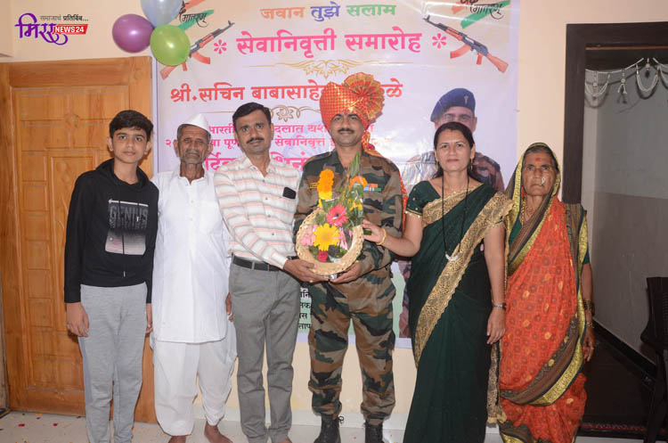 अहमदनगर (प्रतिनिधी)- भारतीय सैन्य दलात 20 वर्ष देश रक्षणाच्या सेवेनंतर तपोवन रोड, निर्मलनगर येथील मेजर सचिन बाबासाहेब दहिफळे नुकतेच निवृत्त झाले. सेवापुर्तीनिमित्त त्यांचा सन्मान करुन सत्कार करण्यात आला. यावेळी बाबासाहेब दहिफळे (वडिल), जिजाबाई दहिफळे (आई), बंडू नागरगोजे, किरण आव्हाड, बबन कुसळकर, स्वामी म्हस्के, कारभारी सांगळे, गणेश दराडे, बंडू मोरे, महेश आव्हाड, सचिन दासपुते, रावसाहेब राउतराय, शैलेश देशमुख,शिवाजी भाबड, इंदुबाई नागरगोजे, भाग्यश्री सांगळे, प्रियंका दराडे, प्रणील नागरगोजे, प्रांजल नागरगोजे, सुभाष दहिफळे आदींसह मित्रपरिवार मोठ्या संख्येने उपस्थित होते.