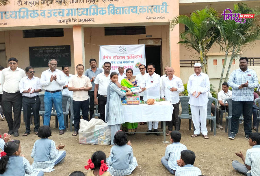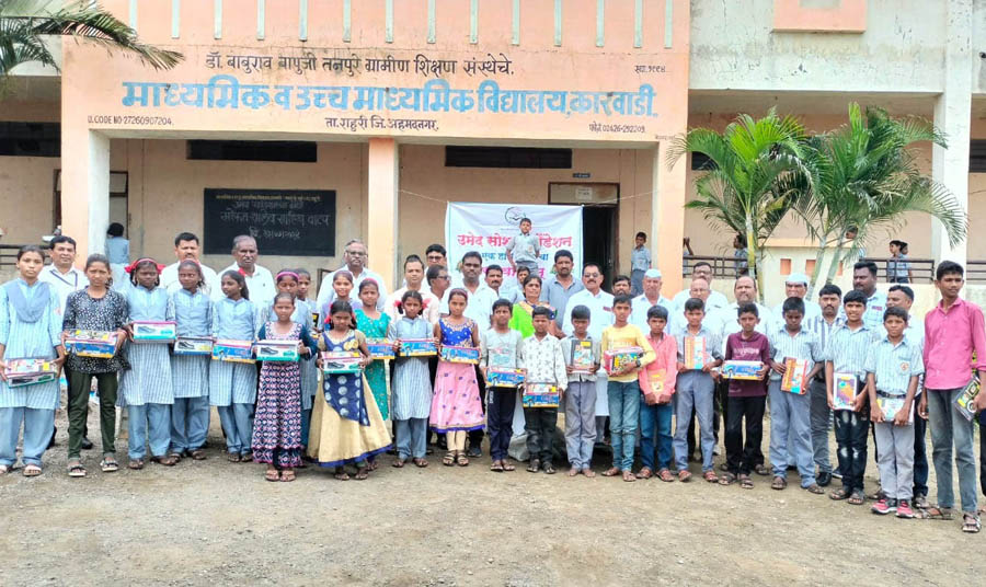 राहुरी तालुक्यातील कारवाडी येथील माध्यमिक व उच्च माध्यमिक विद्यालयात हा उपक्रम राबविण्यात आला. कारवाडीच्या महिला सरपंच स्वातीताई कवडे यांच्या अध्यक्षतेखाली झालेल्या शैक्षणिक साहित्य वाटप कार्यक्रमाप्रसंगी पंचायत समिती सदस्य रवींद्र आढाव, रामभाऊ सोळुंके, काशिनाथ पवार, संदीप मुंगसे, मच्छिंद्र रिंगे, राहुल पवार, कारवाडी प्राथमिक शाळाचे मुख्याध्यापक पटारे, माध्यमिक व उच्च माध्यमिक विद्यालयाचे प्रभारी मुख्याध्यापक जब्बार पठाण, प्रदीप तनपुरे, बाळासाहेब राऊत, अर्जुन वाणी, सुनील कपिले, मंदा शिंदे, बाळासाहेब बोंबले, कारंजकर संतन, उमेद सोशल फाऊंडेशनचे अध्यक्ष अनिल साळवे, उपाध्यक्ष कुनाल तनपुरे, खजिनदार संजय निर्मळ, सदस्य नुरिल भोसले, विजय लोंढे, रवी साखरे आदी उपस्थित होते.