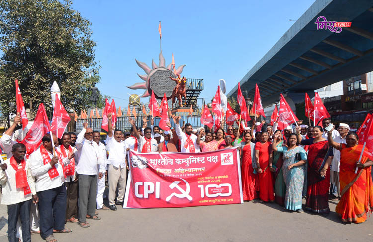 अहिल्यानगर (प्रतिनिधी)- भारतीय कम्युनिस्ट पक्ष (भाकप) स्थापनेच्या शताब्दीनिमित्त शहरातील बुरुडगाव रोड येथील पक्ष कार्यालयासमोर शुक्रवारी (दि. 26 डिसेंबर) उत्साहात ध्वजारोहण करण्यात आले. यावेळी भाकपचे लाल ध्वज फडकावत ‘लाल सलाम’च्या घोषणा देण्यात आल्या. देशासाठी पक्षाने दिलेल्या त्याग, बलिदान आणि संघर्षाच्या इतिहासाची आठवण करून देत शहरातून भव्य रॅली काढण्यात आली.