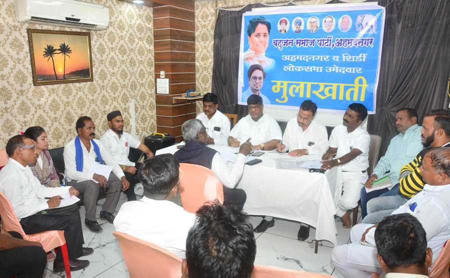 वाजिद शेख अहमदनगर (प्रतिनिधी)- लोकसभा निवडणुकीच्या पार्श्वभूमीवर बहुजन समाज पार्टीच्या वतीने शहरात नगर दक्षिण व शिर्डी लोकसभेच्या इच्छुक उमेदवारांच्या मुलाखती घेण्यात आल्या. दोन्ही मतदार संघातील इच्छुक उमेदवारांनी तारकपूर येथील एका हॉटेलमध्ये झालेल्या मुलाखतीसाठी कार्यकर्त्यांसह मोठी गर्दी केली होती.