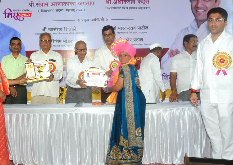 टिळकरोड येथील लक्ष्मीनारायण मंगल कार्यालयात झालेल्या पुरस्कार वितरण सोहळ्याप्रसंगी आमदार संग्राम जगताप, हिंद सेवा मंडळाचे अध्यक्ष शिरीष मोडक, प्राथमिक शिक्षण विभागाचे शिक्षणाधिकारी भास्करराव पाटील, मनपा शिक्षण मंडळाचे प्रशासन अधिकारी जुबेर पठाण, संयोजन समितीचे प्रा. माणिक विधाते, ज्ञानदेव पांडुळे आदी उपस्थित होते.