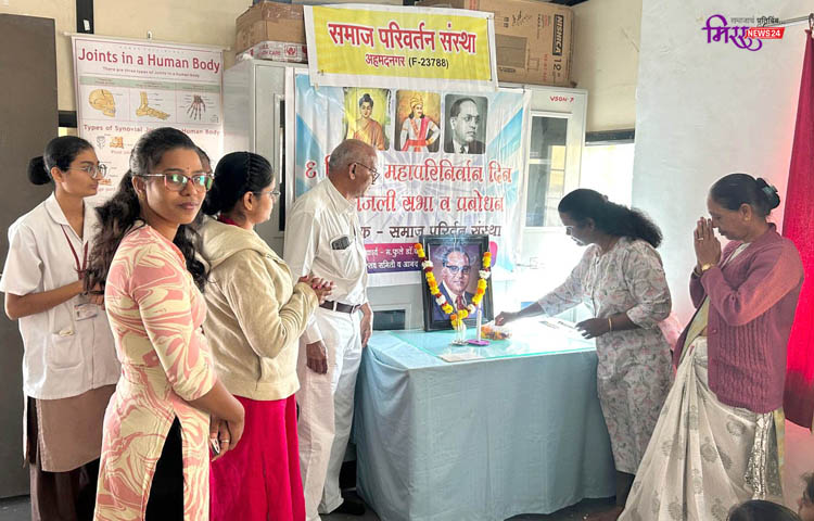 अहिल्यानगर (प्रतिनिधी)- महामानव भारतरत्न डॉ. बाबासाहेब आंबेडकर यांच्या महापरिनिर्वाण दिनानिमित्त पाईपलाईन रोडवरील वेदिका नर्सिंग कॉलेज आणि समाज परिवर्तन संस्था यांच्या संयुक्त विद्यमाने अभिवादन करण्यात आले.
