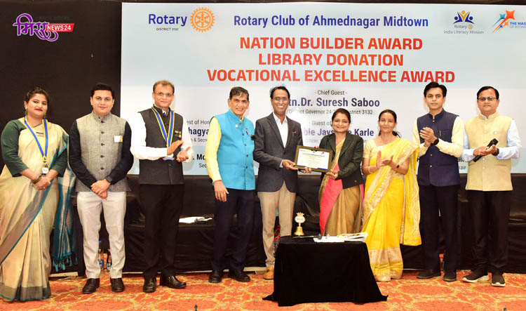 अहमदनगर (प्रतिनिधी)- रोटरी क्लब ऑफ अहमदनगर मिडटाऊनतर्फे स्नेहबंध सोशल फाउंडेशनचे संस्थापक अध्यक्ष डॉ. उद्धव शिंदे यांना राष्ट्र भावनेने प्रेरित होऊन समाज उपयुक्त काम करत असल्याबद्दल व्होकेशनल एक्सलन्स अवॉर्ड 2024 ने गौरविण्यात आले. जिल्हा विधी सेवा प्राधिकरणाच्या सचिव न्यायाधीश भाग्यश्री पाटील यांच्या हस्ते त्यांना पुरस्कार प्रदान करण्यात आला.