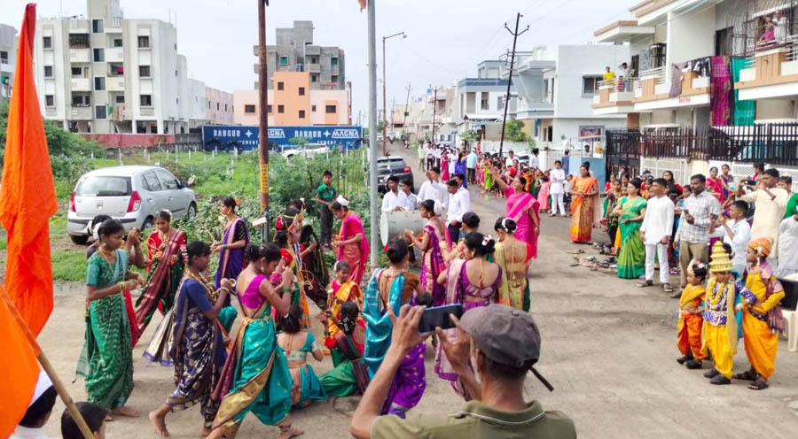 पारंपारिक वाद्यांच्या गजरात व लेझीम, झांज पथकासह दिंडी काढण्यात आली होती. पांढरी टोपी, कपाळी गंध, पायजमा, बंडी या पोशाखातील लहान मुले, तर रंगीबेरेंगी साड्या परिधान करुन मुली डोक्यावर तुलसी वृंदावन घेऊन दिंडीत सहभागी झाल्या होत्या. टाळच्या गजरात ज्ञानोबा… तुकाराम… च्या जयघोषाने परिसर निनादला.