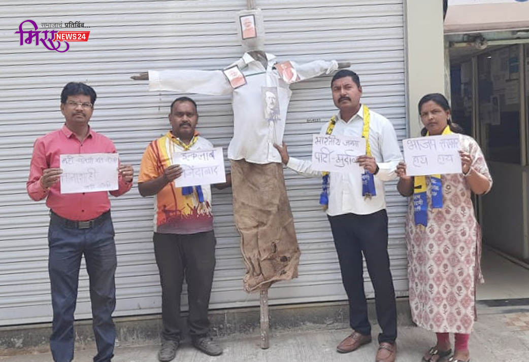 पुतळ्यास पंतप्रधान व केंद्रीय गृहमंत्री यांच्या प्रतिमा टांगून तानाशाही आणि हिटलरशाही विरोधात घोषणा