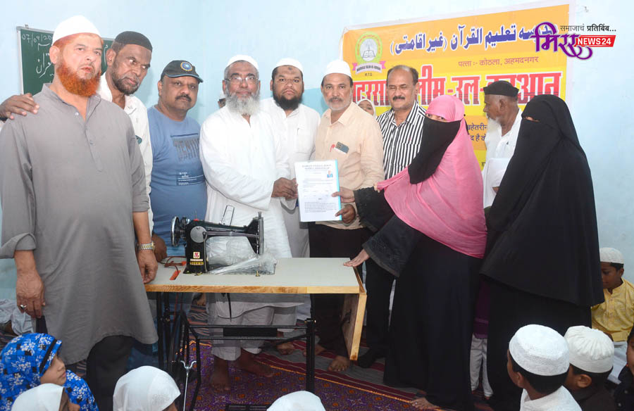 आफताब शेख अहमदनगर (प्रतिनिधी)- शहरातील कोठला भागातील विधवा महिलांना स्वयंरोजगार उपलब्ध होवून त्यांच्या सक्षमीकरणाच्या उद्देशाने मदरसा तालीम-उल-कुरआनच्या वतीने शिलाई मशीन भेट देण्यात आली. यावेळी सामाजिक कार्यकर्ते अल्ताफ सय्यद, करीम हुंडेकरी, हाजी शौकत तांबोली, मौलाना अब्दुस सलाम, मुजाहिद (भा) कुरेशी, ॲड. फारूक बिलाल, निसार बागवान, नासिर शेख, हाफिज अब्दुल अहमद, हाफिज खालिद, मौलाना अब्दुल कादिर, मौलाना शफिक, मुस्तफा खान, नसीर खान आदी उपस्थित होते.